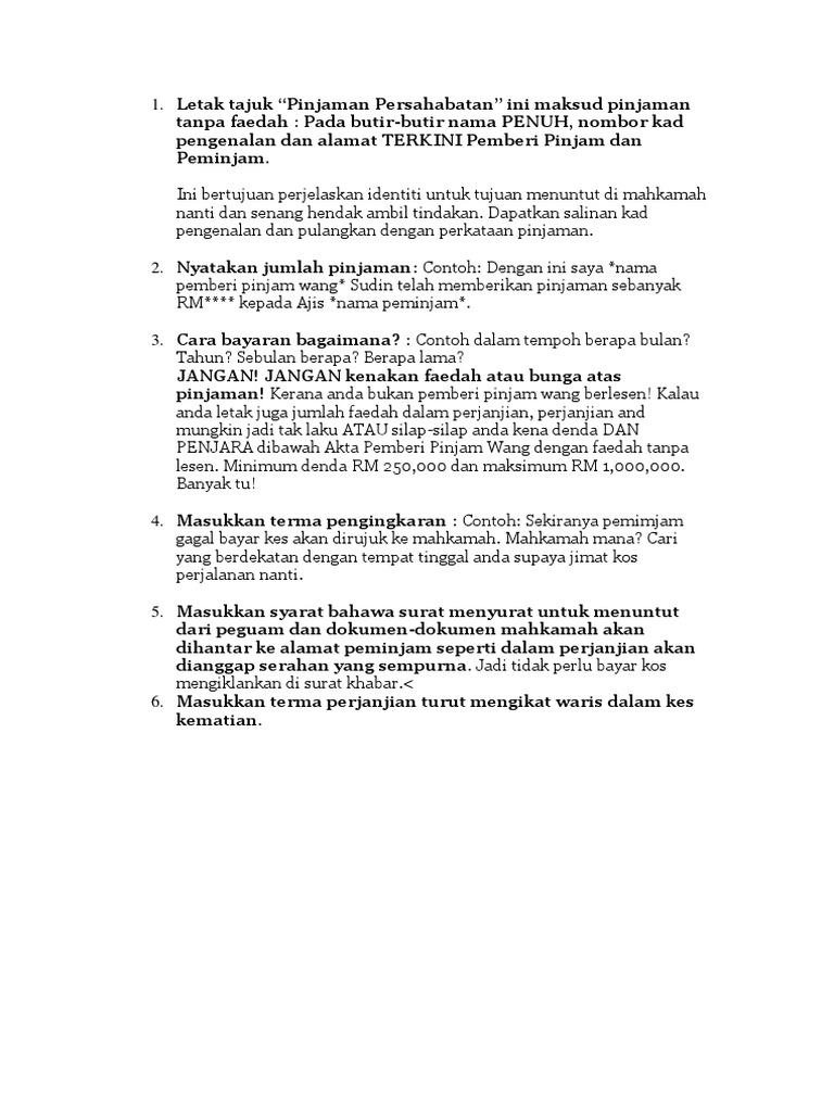 Surat perjanjian pinjam uang yang akan dibuat harus berisi informasi yang jelas mengenai hak dan kewajiban pihak pemberi dan penerima pinjaman yang telah disepakati sebelumnya. YA BETUL pinjaman berlesen pinjaman. Contoh Surat Perjanjian Pinjaman Wang Dengan Kawan.